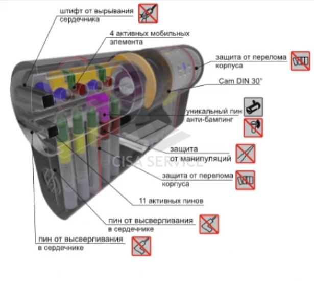 Цилиндр высокой степени секретности с 11 пиновой системой механического кодирования. Для наибольшей защиты имеет 4 подвижных элемента